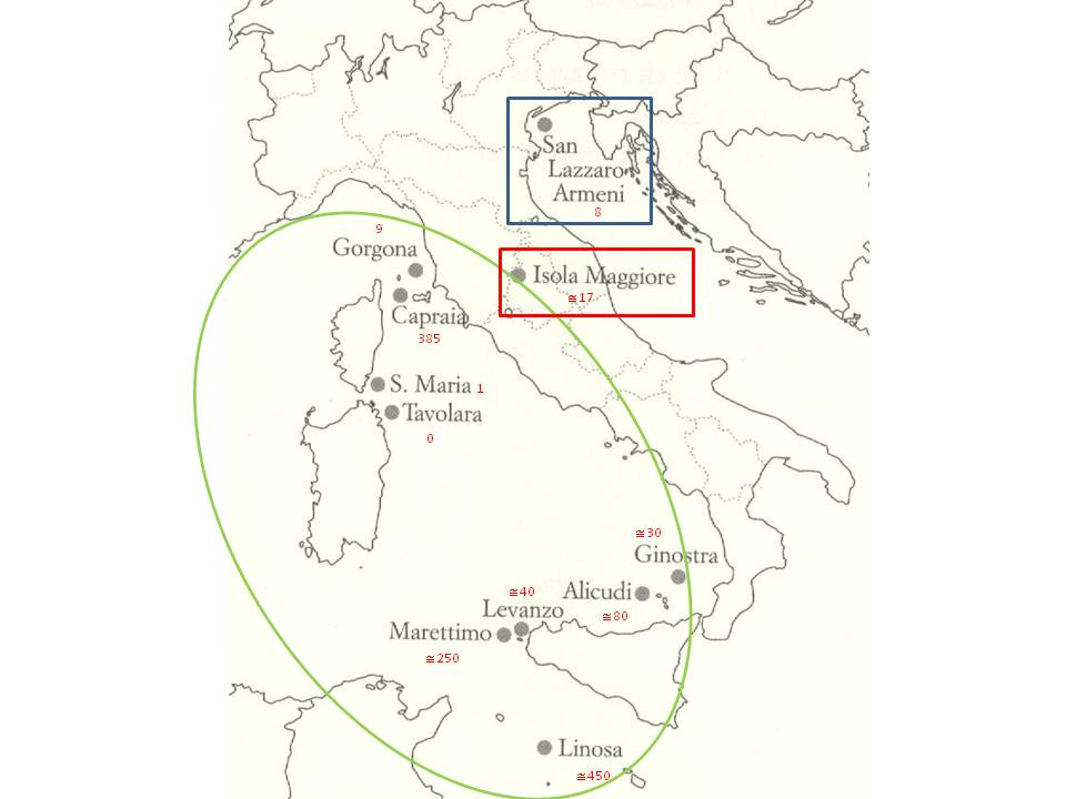 Ho aggiunto a questa carta la popolazione degli abitanti stabili per ogni isola (numeri in rosso) .