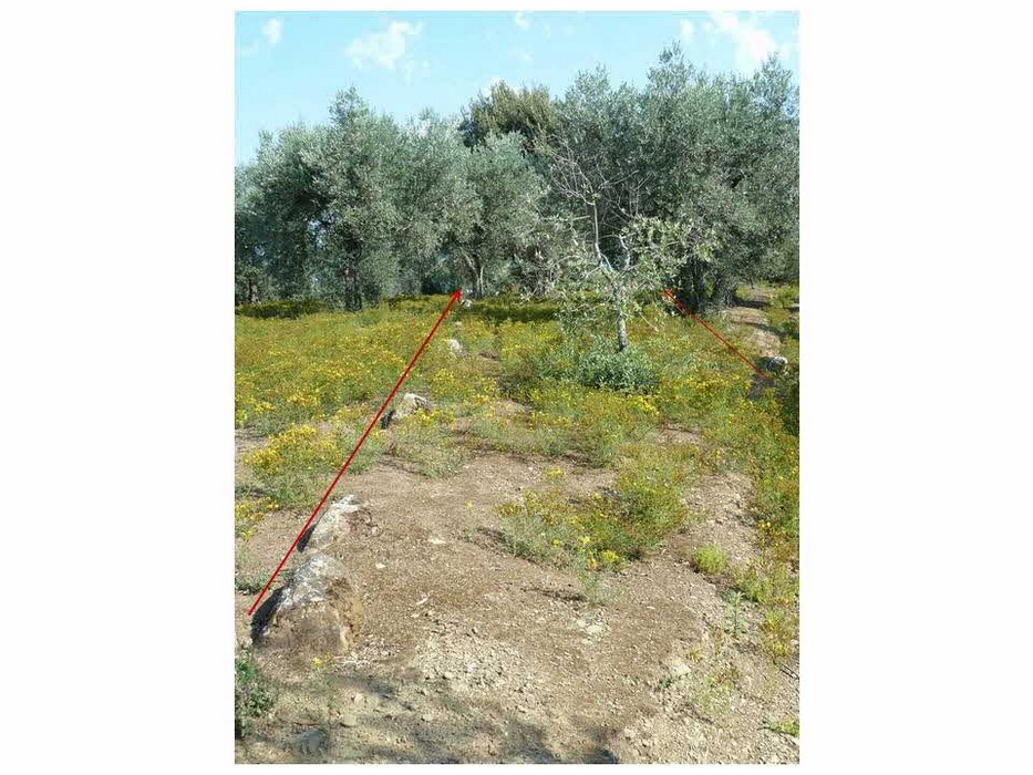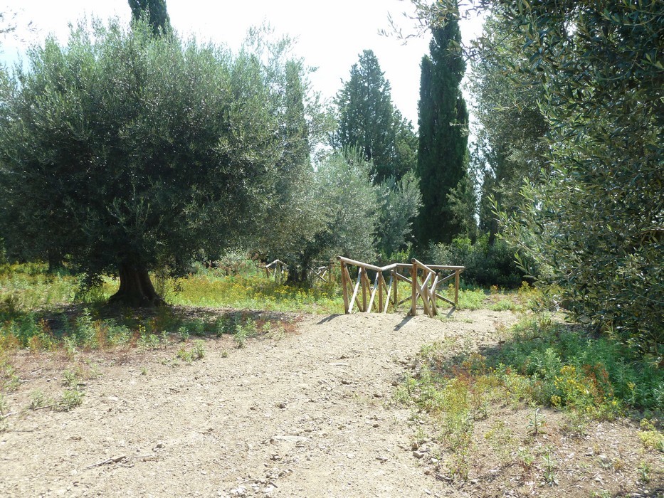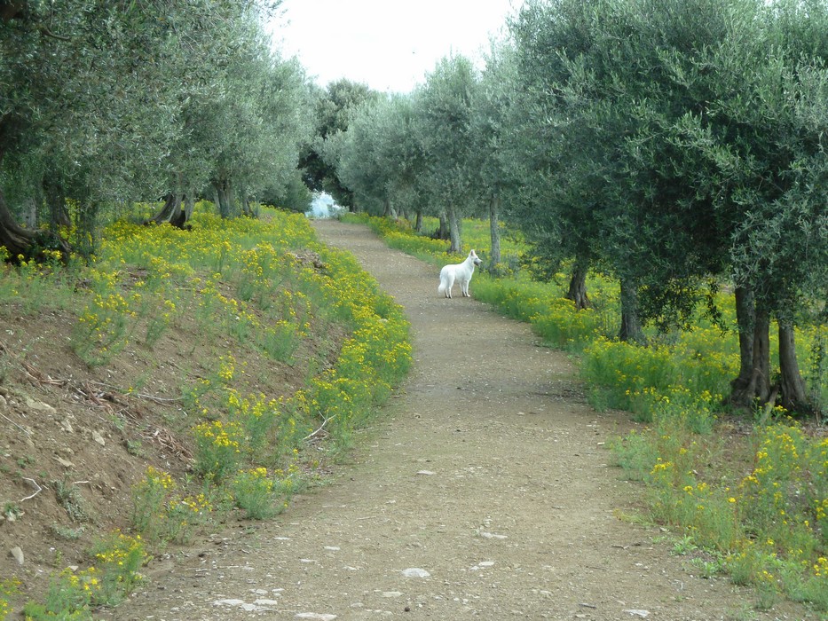 La strada traverse une oliveraie, ensoleillée en juin d’un tapis de fleurs jaunes (9/06/2011)
