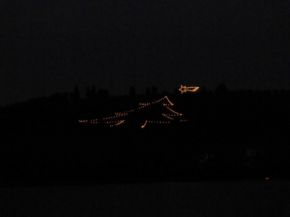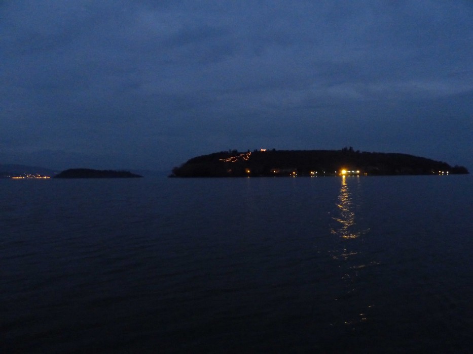 Au crépuscule, de gauche à droite, les lumières de Passignano, l’Isola Minore, et l’Isola Maggiore avec le sapin de Noël et l’étoile de Bethléem qui commencent à se deviner…