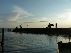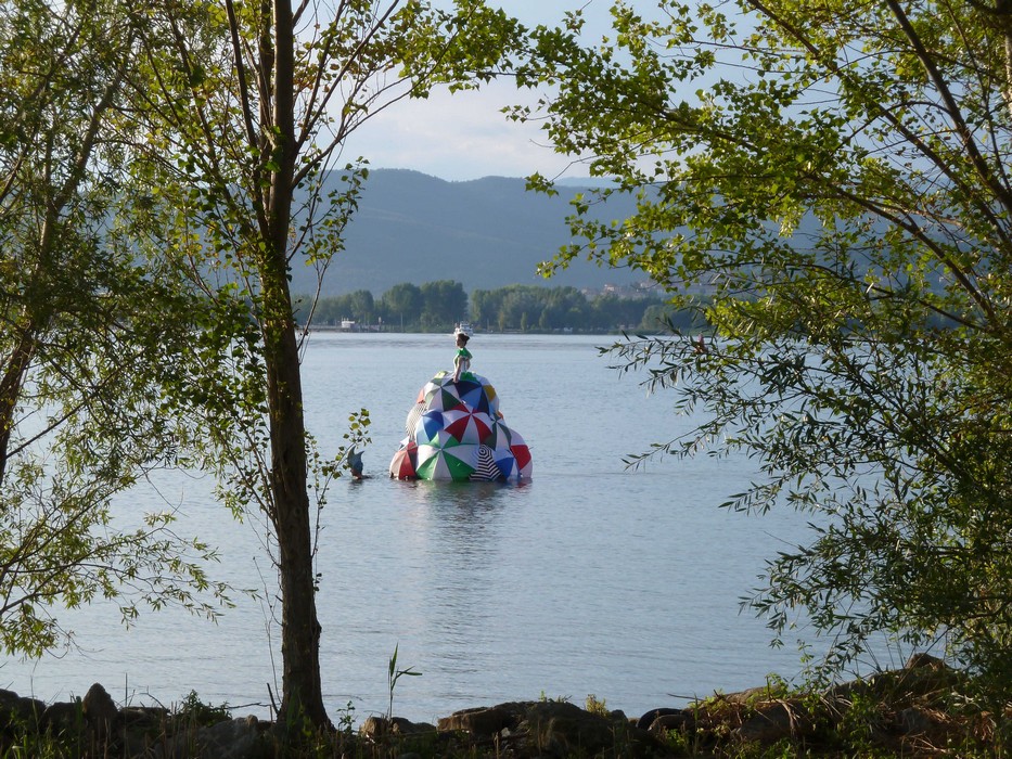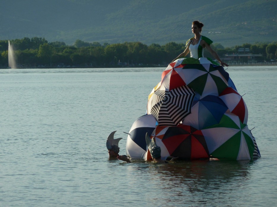 Une poupée humaine de deux mètre et demi, vêtue d’une robe constituée de parapluies multicolores, évolua hiératiquement sur l’eau, dans la sérénité de la lente tombée du jour.