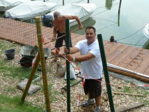 De gauche à droite, Ettore et Mario terminant l’enceinte grillagée par la pose des portes d’accès.