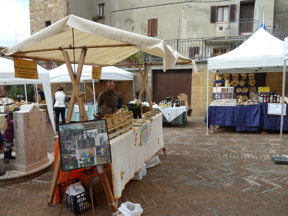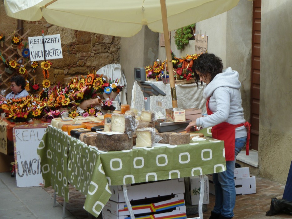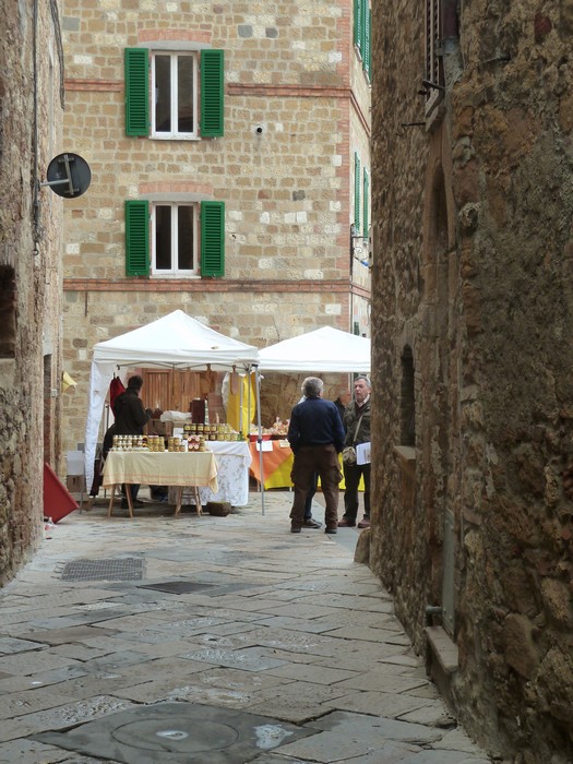 A peine entrés à Pienza, nous aperçumes au bout d’une ruelle latérale une des manifestations préférées de Fabienne : un marché !