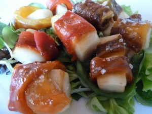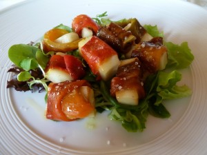 Il s’agissait de “Rouleaux tièdes de poivrons grillés, farci de fromage ‘Primo Sale‘ à la pistache de Bronte sur un lit de salades variées”