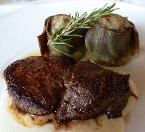 J’ai donc opté pour un ” Filet de boeuf sur une crème de fromage ‘Permigiano Reggiano‘ et artichauts farcis“.
