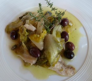 Comme secondo piatto, Fabienne avait choisi un “Filet de bar servi sur un lit d’endives sautées, câpres de Pantelleria et olives noires de Gaeta“.