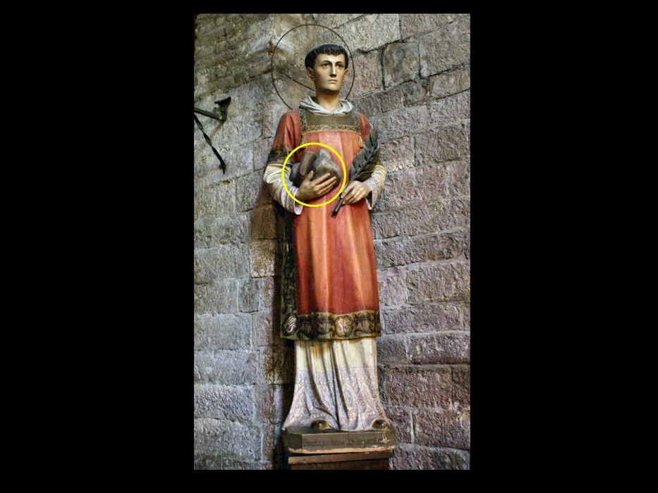 Il est toujours représenté sous les traits d’un jeune homme imberbe; il porte la dalmatique du diacre, avec l’étole….Depuis le XII° siècle, il tient à la main, ou sur un livre, ou en équilibre sur sa tête, une ou plusieurs pierres évoquant sa lapidation..