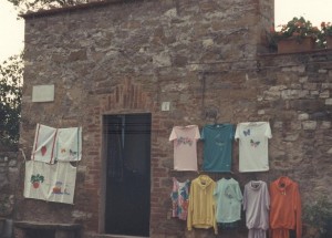 Elle ouvre alors, à l’ancienne Poste de l’ Isola Maggiore (N° 9 de la via Guglielmi), un magasin de peinture sur tissu au stencil.