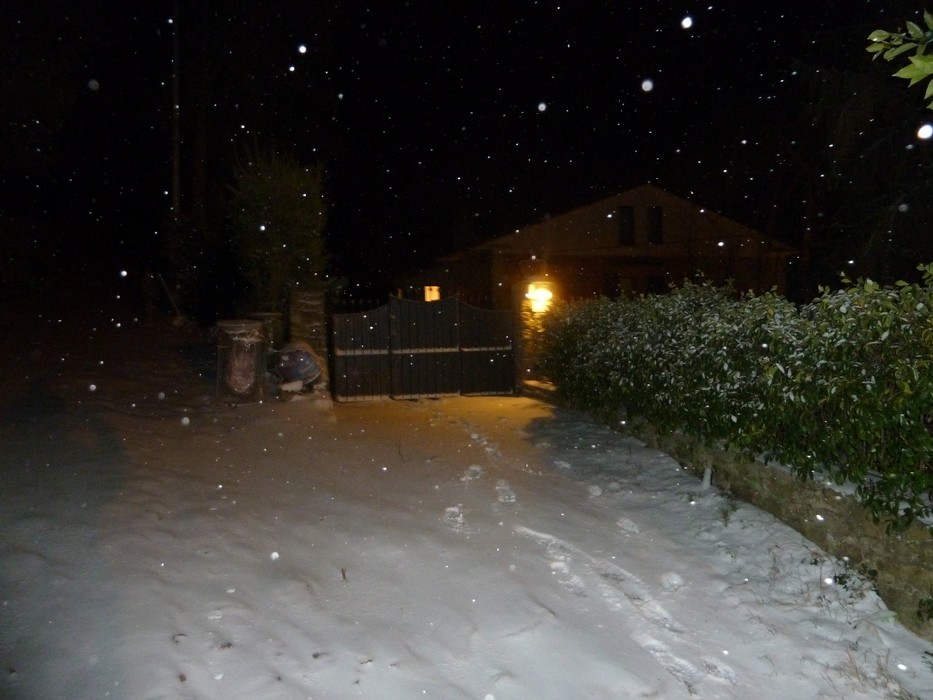 Décidé à goûter la vue nocturne de la via Guglielmi sous la neige, je sors par notre jardin…