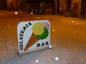 La pancarte du bar de Silvia Silvi paraît réellement anachronique dans ce cadre hivernal…