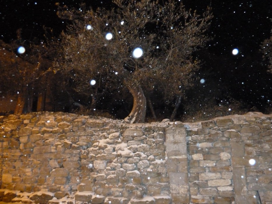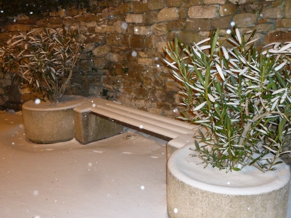 Les quelques murets et oliveraies qui pointent leur nez dans la via Guglielmi commencent également à bénéficier d’une délicate parure neigeuse.