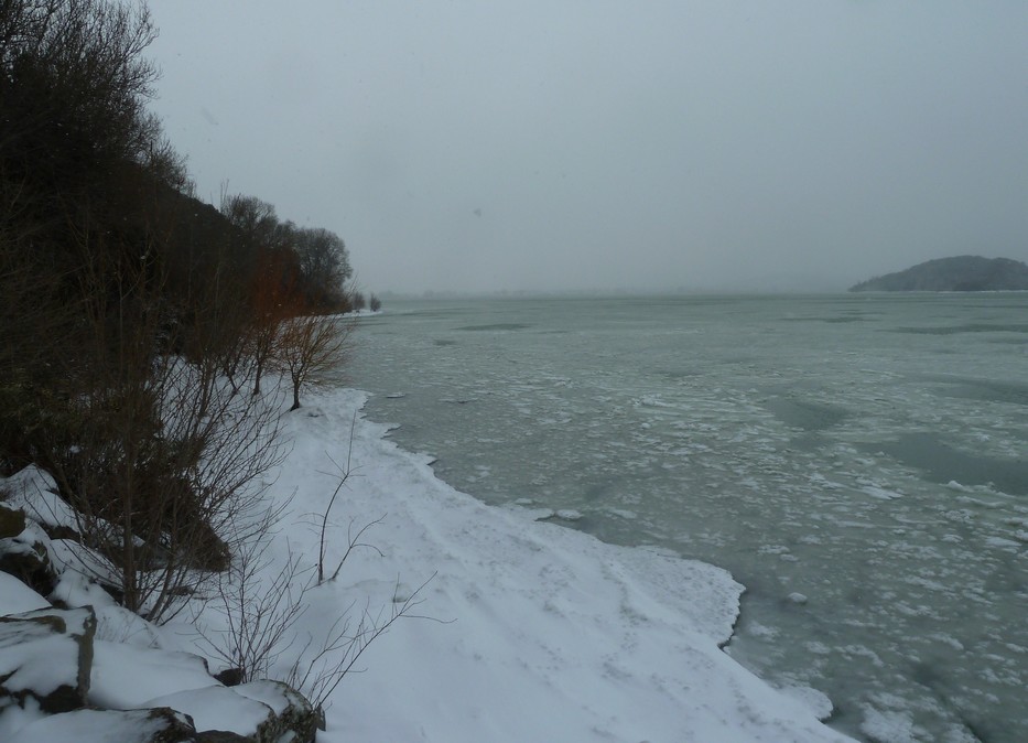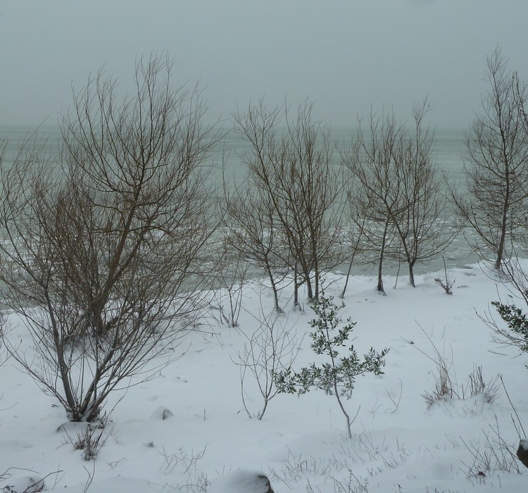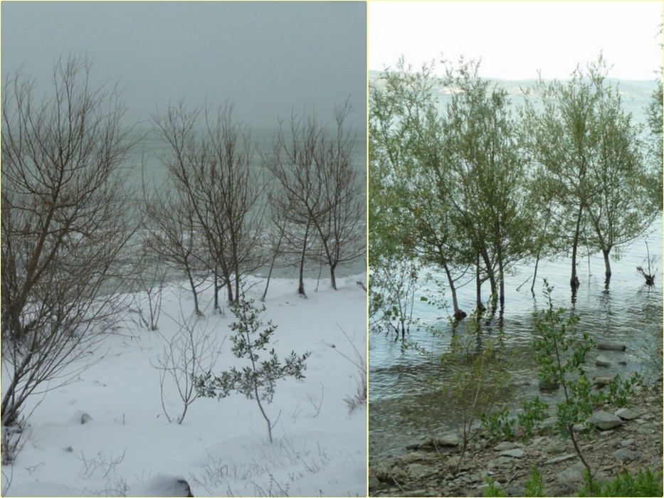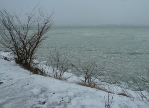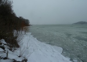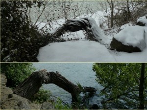 Sur la berge, les arbres qui avaient les pieds dans l’eau au cours de l’été 2011, baignent cette fois dans un champ de neige…