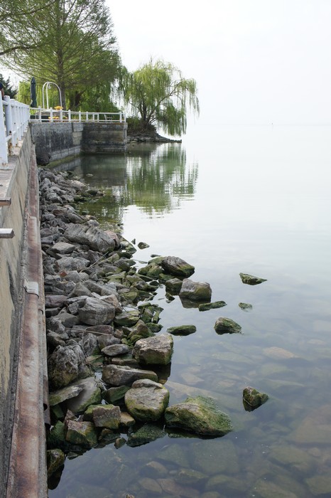 Versant extérieur de notre digue où les roches sous l'eau sont très visibles, le 1/04/2010