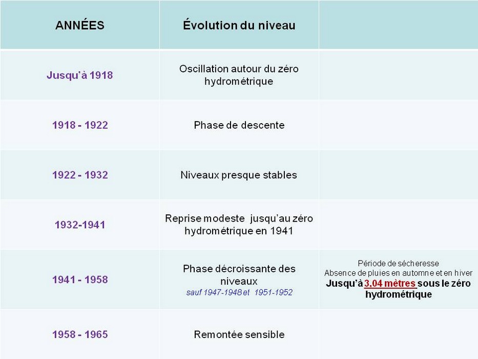 Tableau des variations de niveau du Trasimène de 1912 à 1965