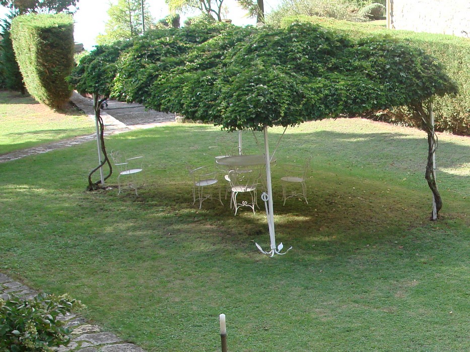A cette époque, la pelouse le long de la façade latérale de la maison était occupée uniquement par un auvent de jardin couvert de feuillage.