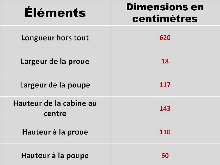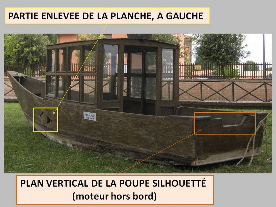 Le plan vertical de la poupe (« tableau ») a été renforcé et silhouetté de façon à accueillir le moteur hors bord que l’on manoeuvrait assis sur une des deux banquettes en bois, en forme de demi-lune.