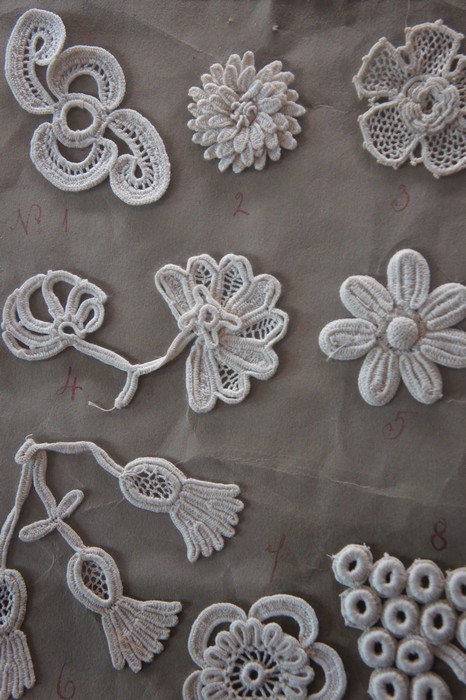 Les motifs floraux, plats ou en relief, sont exécutés séparément au crochet, le plus souvent par-dessus un gros bourdon, et ils sont reliés entre eux par un réseau également réalisé au crochet.