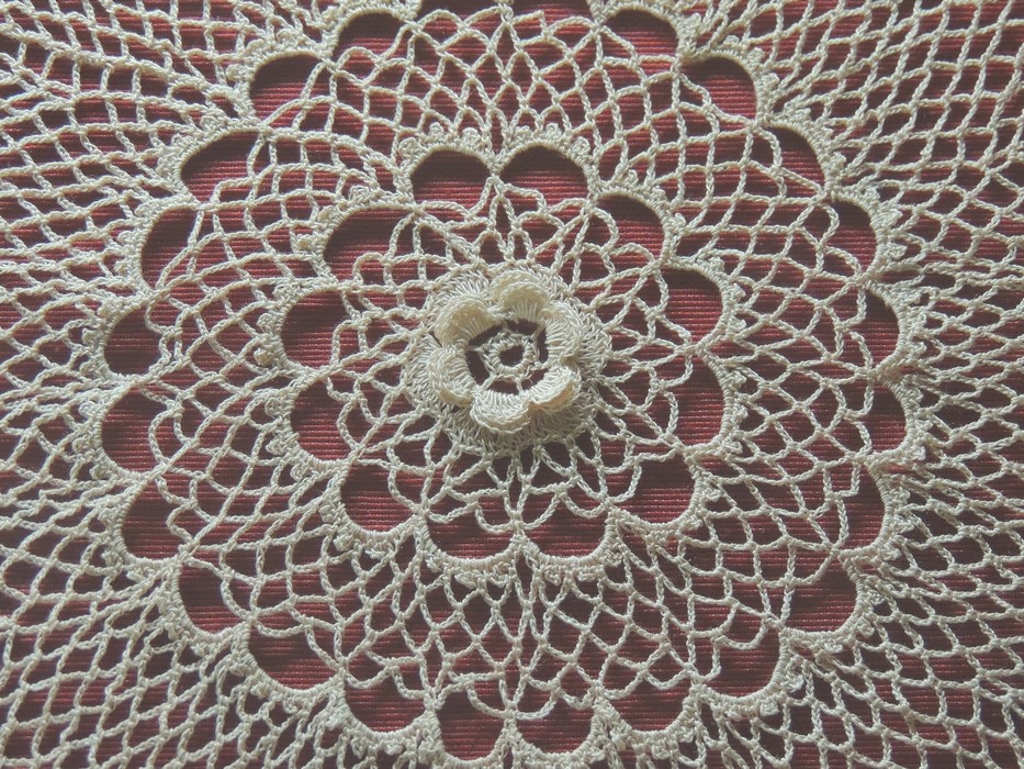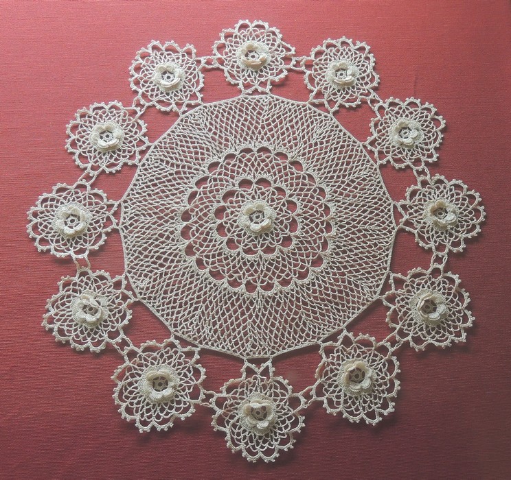 Centre de table, travaillé avec des “petites roses en relief”. Réalisation de la signora Vincenzina Gabbellini.