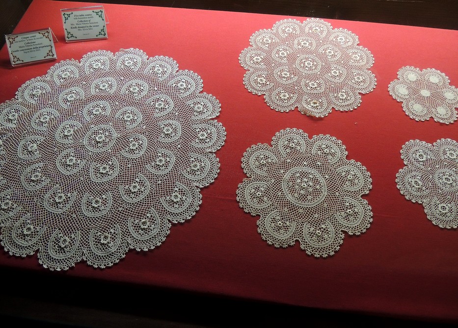 Six centres de table avec des motifs variés, réalisés par la signora Anna De Santis. Mis à la disposition du musée par la signora Maria Pia Scarpocchi.
