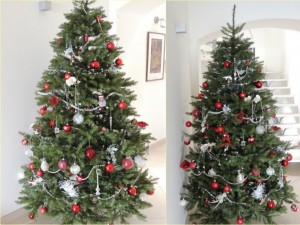 Dans le hall de notre maison à l’Isola Maggiore, le sapin de Noël déjà en place et décoré selon le thème choisi par Fabienne pour 2012 : rouge et blanc.
