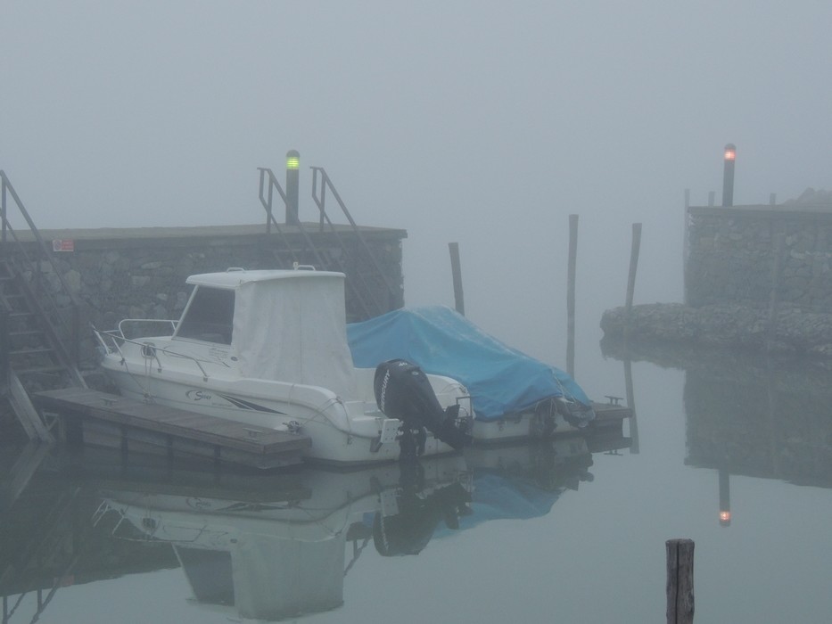 En plein brouillard vespéral, arrivée d’un traghetto à l’Isola Maggiore