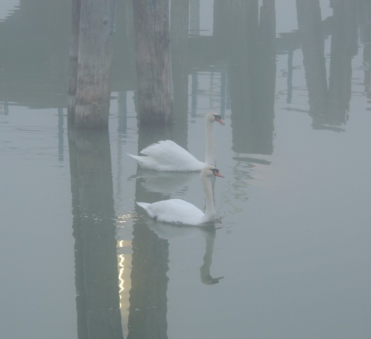 Les bancs de poules d’eau le long de la rive du lungolago sont à peine perceptibles.