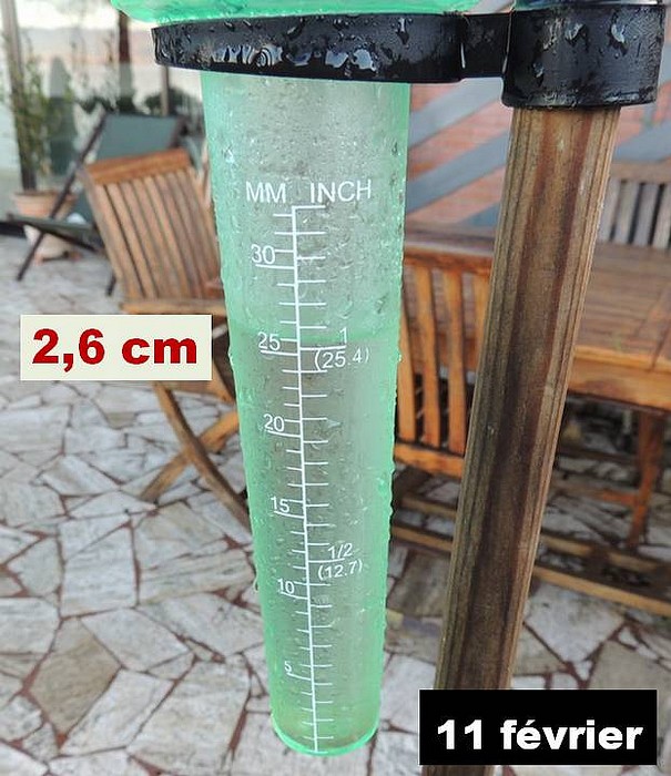 En peu de temps, le pluviomètre a enregistré un gain de 2,6 centimètres.