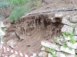 Il muro che corre lungo via Tre Martiri. ha conosciuto uno primo crollo molto parziale.