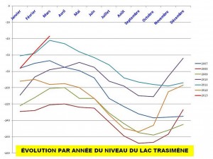 Mais voilà, si l’année 2012 avait été exceptionnelle par la glaciation rarissime du lac Trasimène, cette année 2013 semble devoir l’être par son niveau hydrométrique.