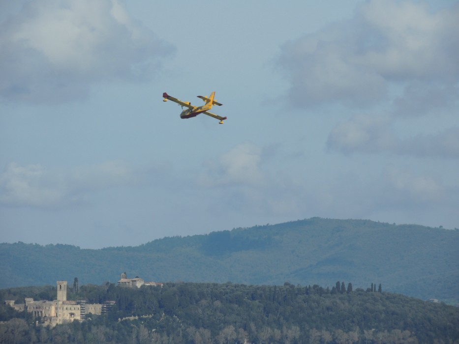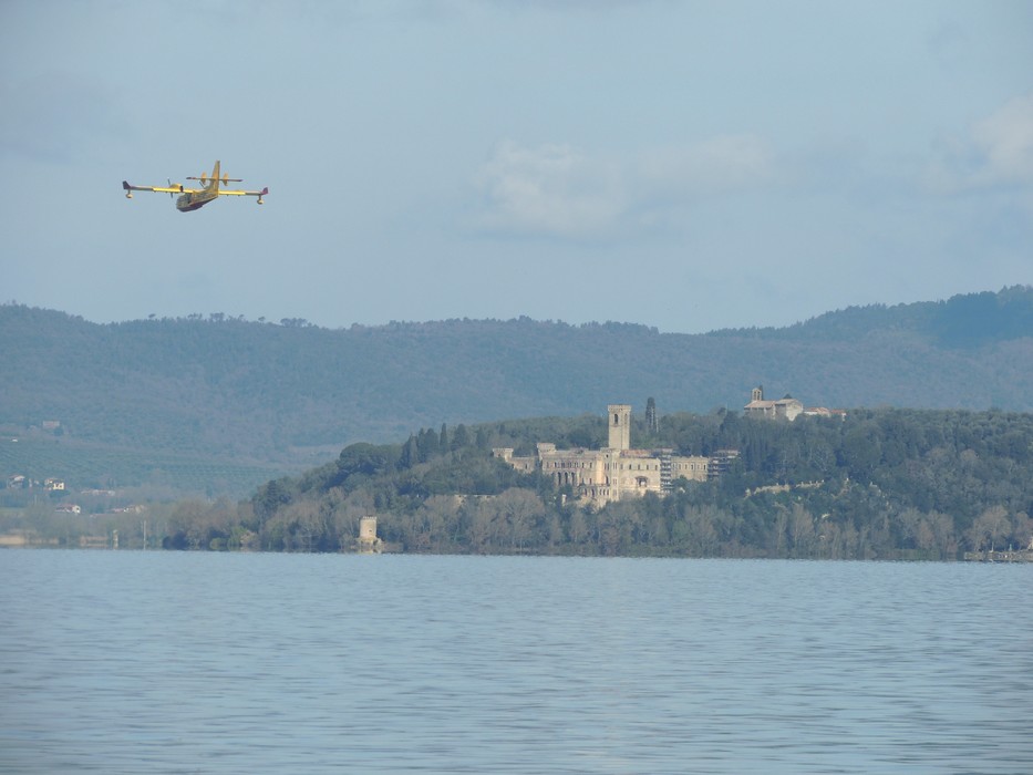 Avant-hier matin, nous avons de nouveau bénéficié d’une autre attraction tout aussi impressionnante : une séance d’entraînement d’un hydravion de la Protection civile italienne sur le lac Trasimène.