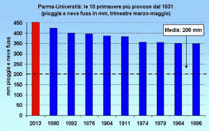 L’Université de Parme a présenté un histogramme avec les dix printemps (trimestre de mars, avril et mai) les plus pluvieux en Italie depuis 1831.