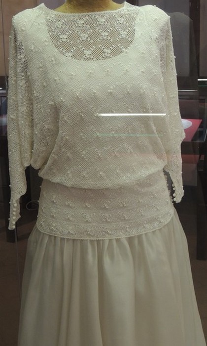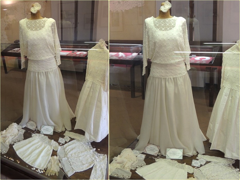 La robe de mariage trône au centre de la salle d’exposition des ouvrages en dentelle réalisés à l’Isola Maggiore.
