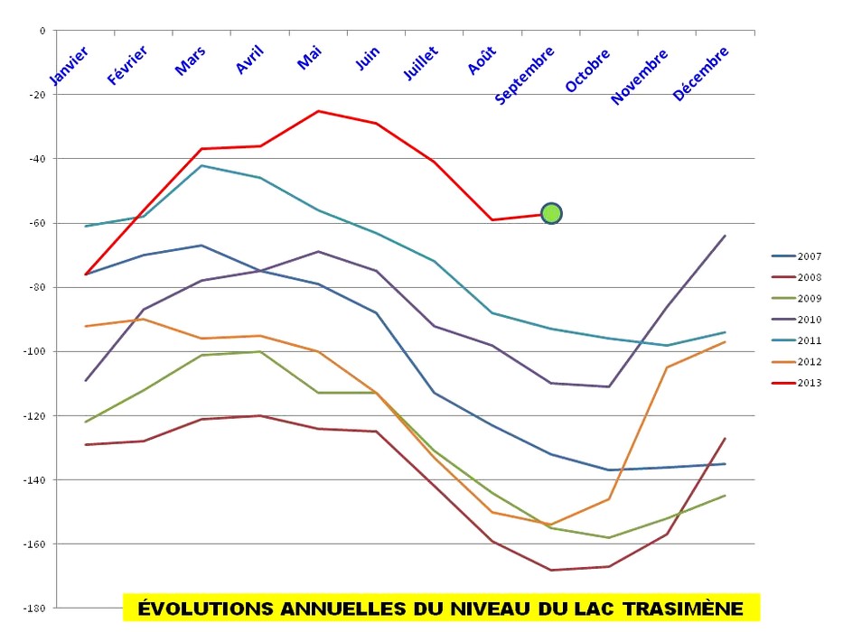Cet apport conséquent de pluie les 29 et 30 septembre 2013 a permis que le niveau du lac Trasimène amorce déjà une légère et précoce remontée.