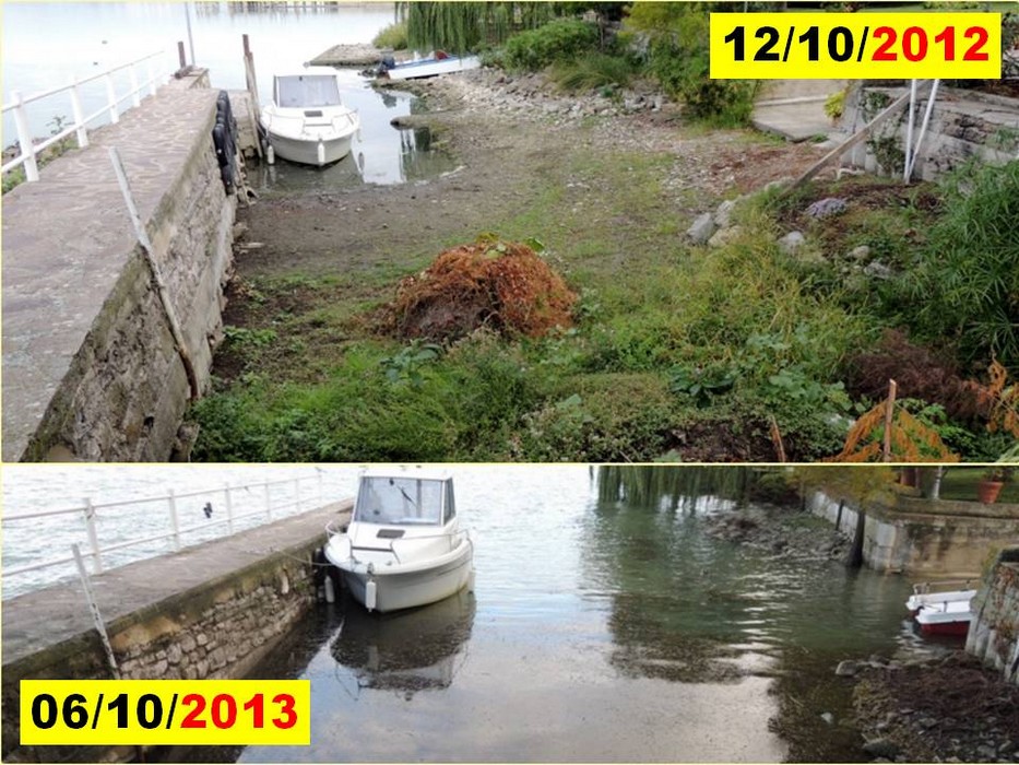 Cette simple comparaison entre deux photos de l’étage inférieur de notre débarcadère privé suffit pour souligner l’élévation de niveau du lac Trasimène en moins de deux jours.