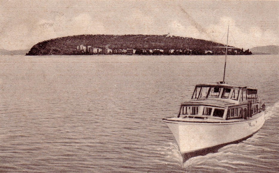1955   –   Un voilier et l’Isola Minore avec son unique maison – Vue prise au départ de l’Isola Maggiore.