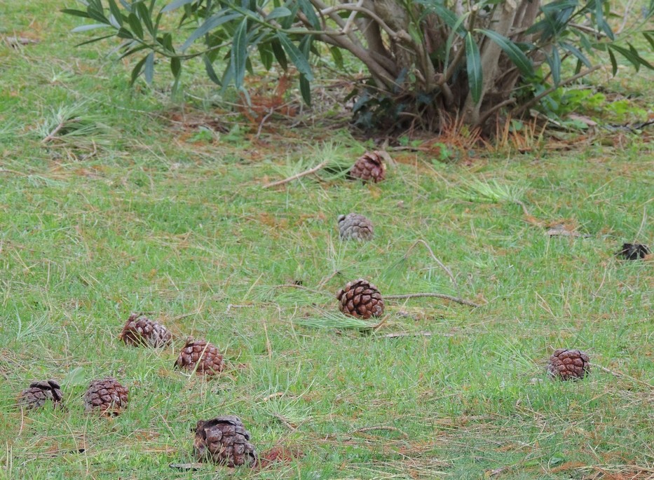 Dans notre jardin, les pommes de pin impitoyablement décrochées par les rafales successives de vent se sont transformées en un véritable « tapis de bombes ».