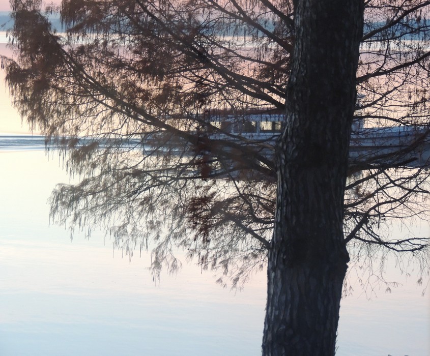 Cette fois j’ai pu photographier la diffusion de la lumière crépusculaire dans le sillage du traghetto vespéral en bout de jardin.