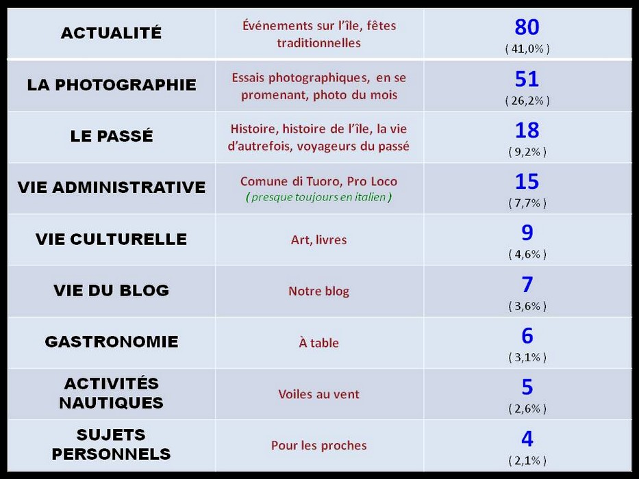 2 – Presque la moitié (41%) de l’activité du blog consiste à relater tous les événements saillants survenus à l’Isola Maggiore ou la concernant directement.