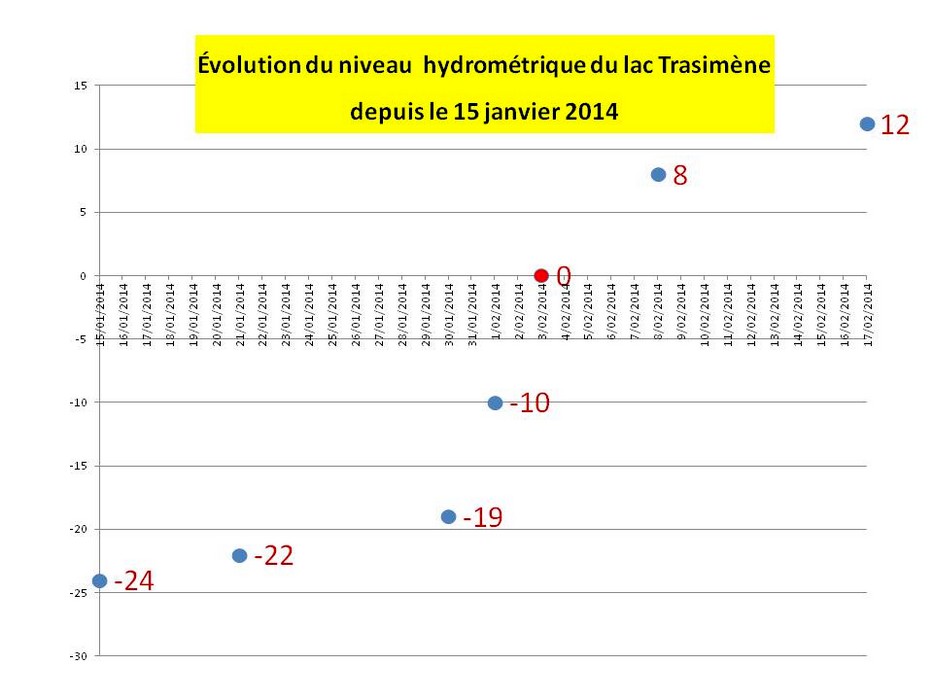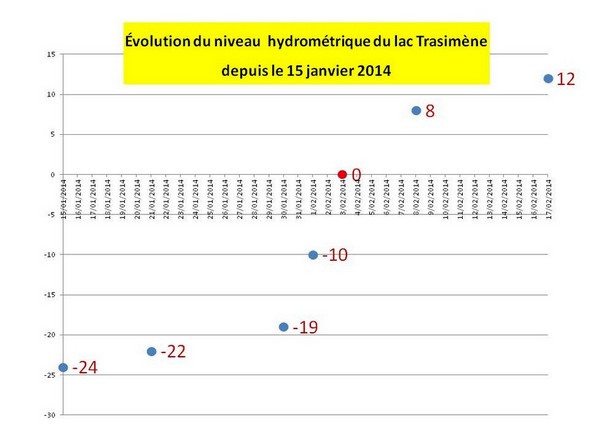 Nous avons résumé dans le diagramme ci-dessous l’allure de l’élévation hebdomadaire progressive du niveau du lac Trasimène au cours de ces dernières semaines.