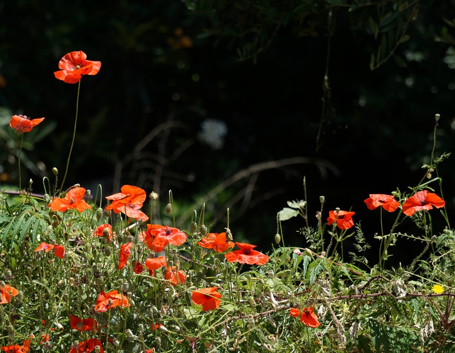 Ici, les coquelicots restent très présents et n"hésitent pas à coloniser le sommet d'un muret...