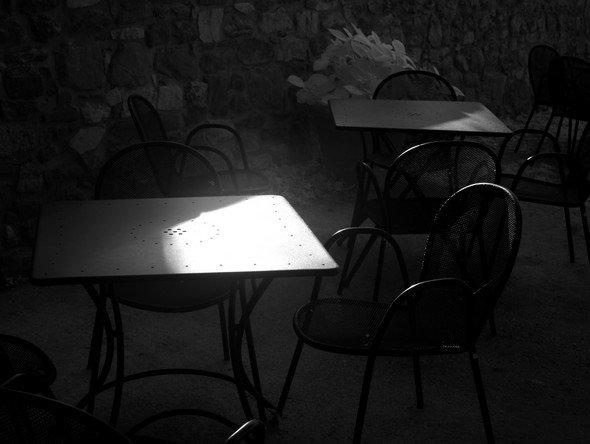 Composition centrée sur la série en diagonale des chaises noires et leur contraste avec les zones ensoleillées.