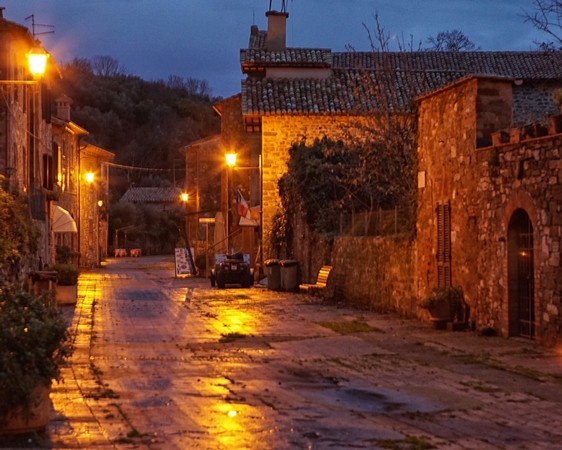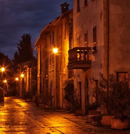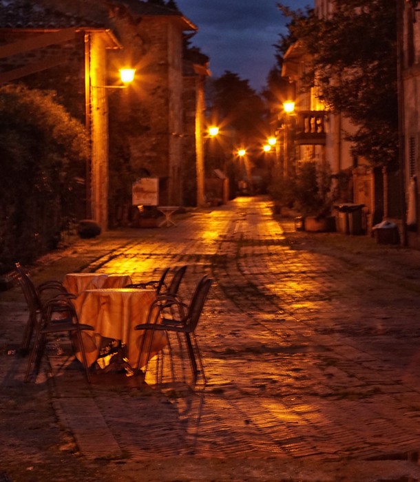 Con la sua illuminazione arancione e calda, questa via vuota trasuda un’atmosfera di mistero.
