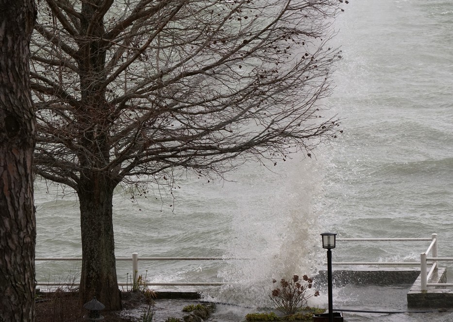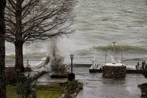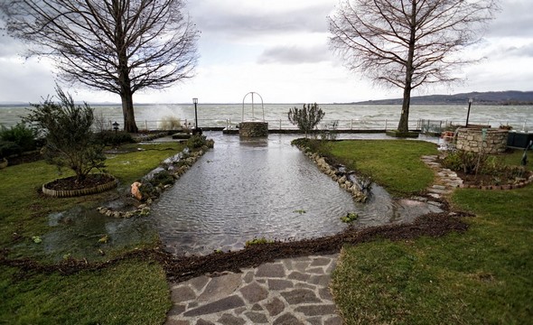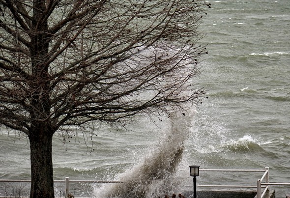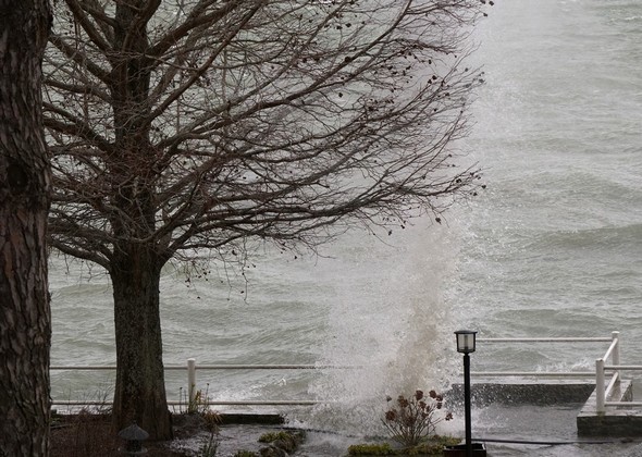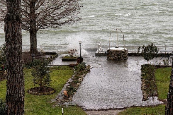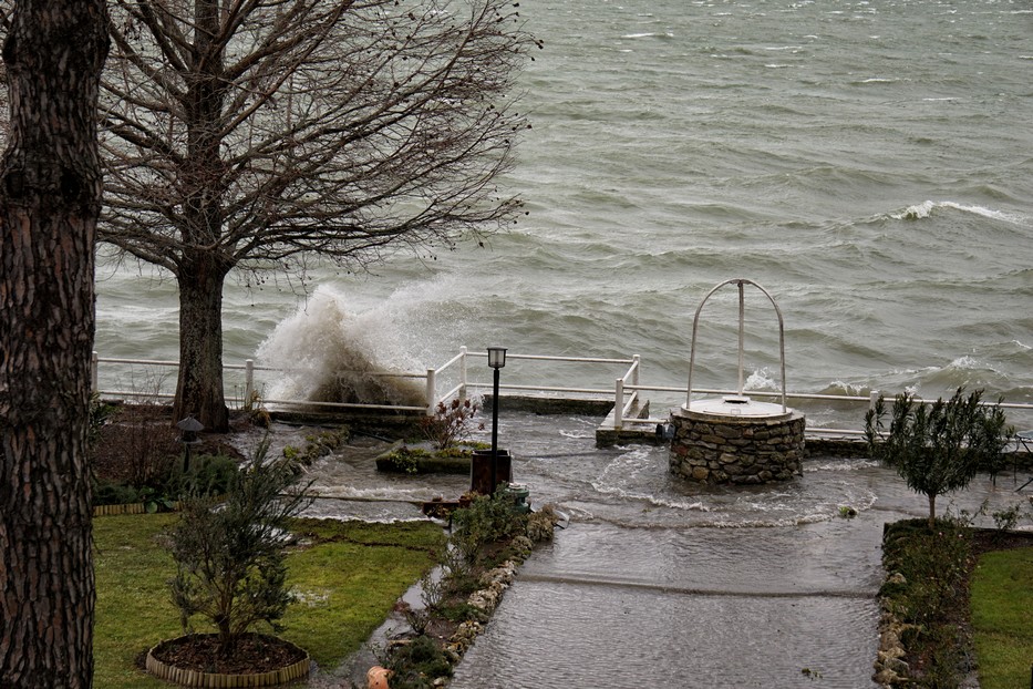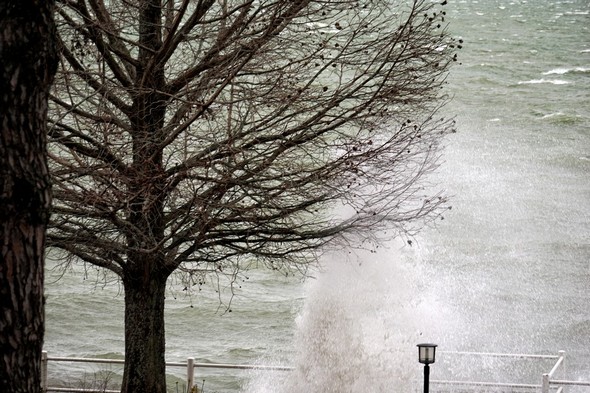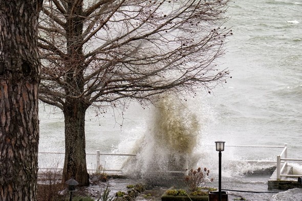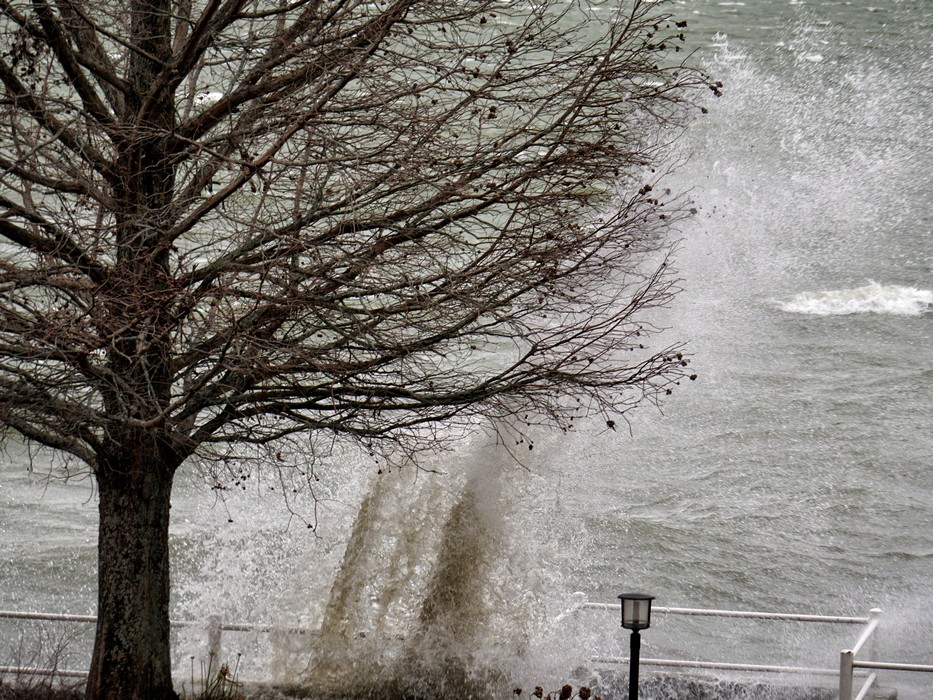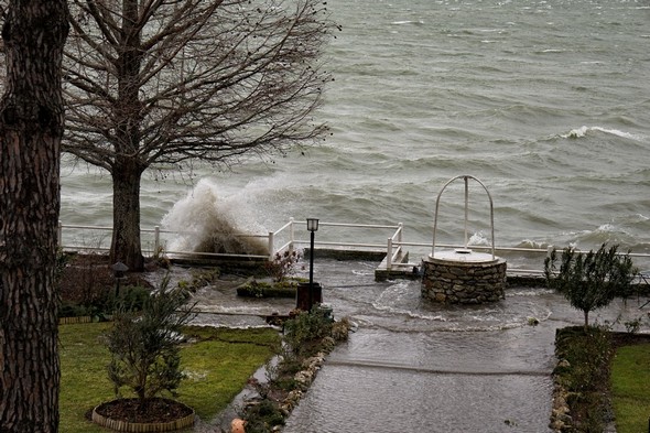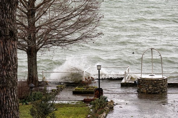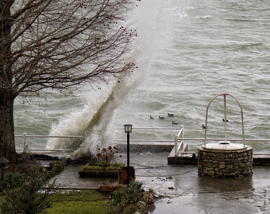 Entraîné par un puissant vent du sud-ouest, le Trasimène, déchaîné, monte à l’assaut de la digue de notre jardin. Isola Maggiore. 30/01/2015 11:06