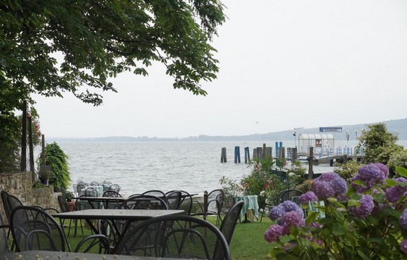 Vue générale du jardin du bar de Silvia avec, à mi-hauteur à droite, le débarcadère de l’Isola Maggiore.