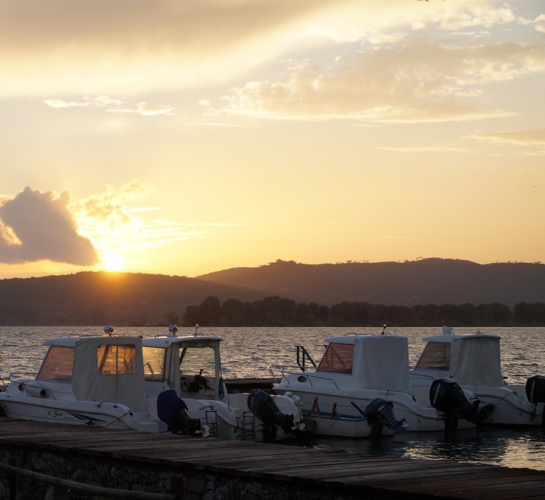 Pilotina” bien alignés dans la darse de l’Isola Maggiore au crépuscule.