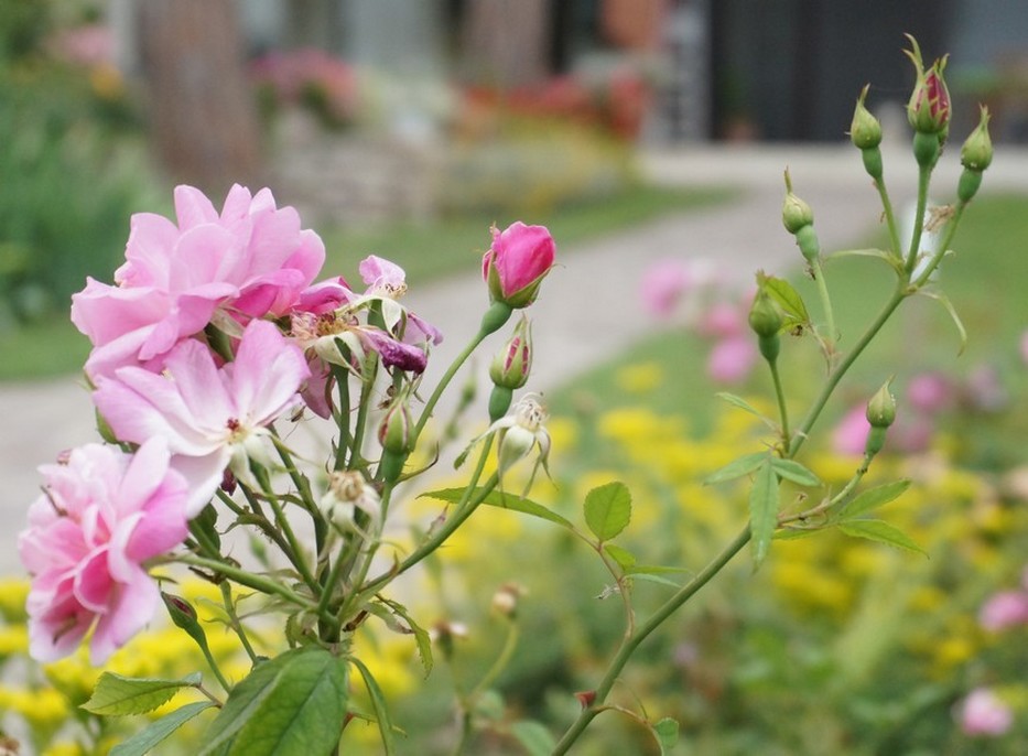 Branche de rosier du parterre qui longe de part et d'autre l'allée menant au lac Trasimène, en bout de notre jardin. © Dinu Wilmotte