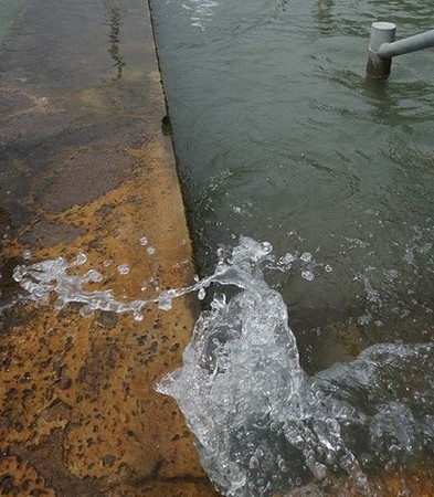 Ecoulement d’eau du Trasimène à travers un des déversoirs de protection creusés dans notre pontile.