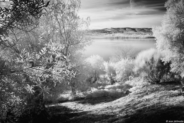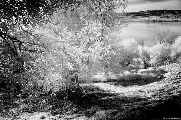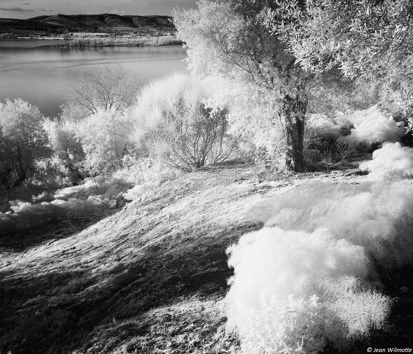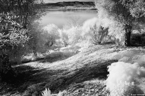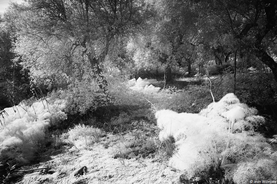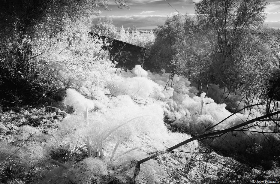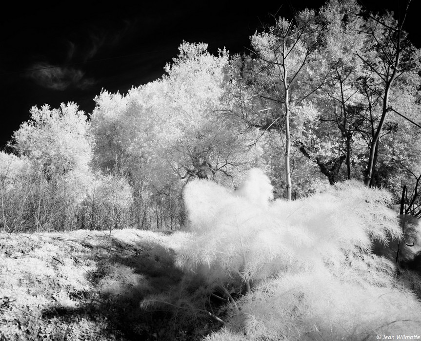 En bas de la photo (partie gauche), à l’avant-plan, le massif des férules communes ressemble, en photographie infrarouge, à un amas neigeux .