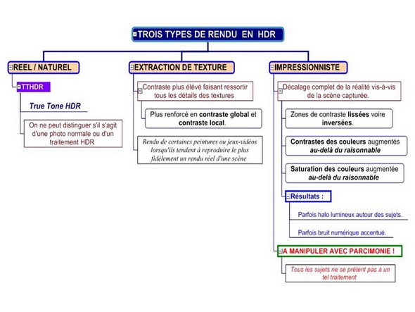 Dans un article de 2011 intitulé “Présentation de la photographie HDR“, Pierre-Henry Muller explique qu’ en post-production, on peut aboutir à trois types différents de rendu des photographies prises en HDR.