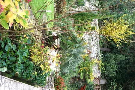 2 – L’été : une belle floraison (dont les câpriers) encadre la rampe qui descend de la grille d’entrée.