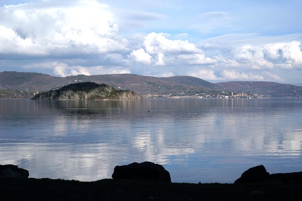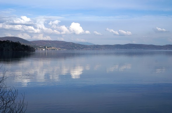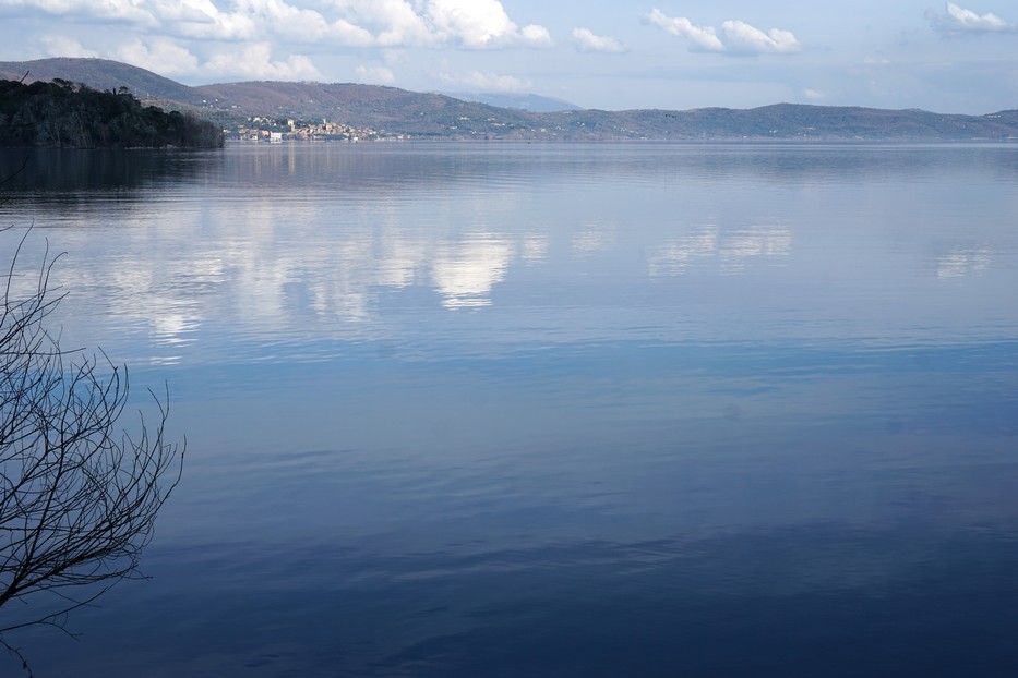 Ciò mi ha permesso durante la mia passeggiata al lungolago, il 12 febbraio in fine di pomeriggio, di scattare foto di un sereno lago Trasimeno, scintillante, con una bella campionatura di blu e dei begli riflessi nuvolosi.